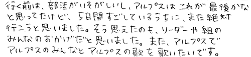 | 離れていても、歌うことでアルプスのことや、友だちの顔が思い出せるって素敵だね。 | |