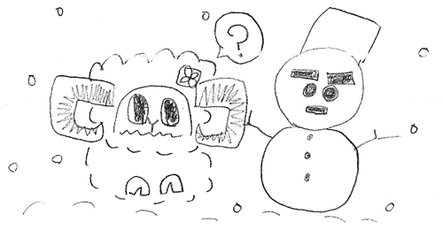 | この白くて冷たいものは何だ?たくさんの雪にひつじもびっくり?雪だるまとひつじの顔がとってもおもしろくていいね。 | |