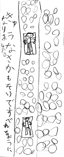 みんなであそんだ山の中の「山ろく荘」を描いてくれたんだね。「おひさま食堂」で、ごはんを食べたのかな。遠くにちゃんと「しぶき荘」も見えるよ。 | |