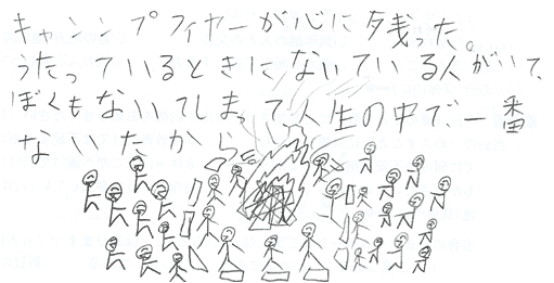 | キャンプファイヤーでみんな楽しそうに歌っているね。でも、さいごは別れるのがさみしくなっちゃうよね。 | |