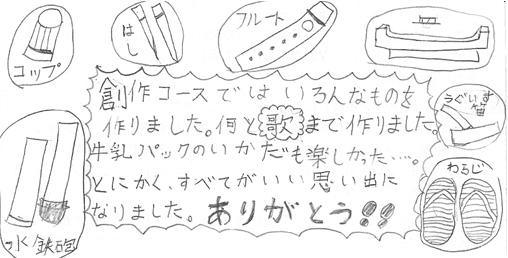 | あそび道具や楽器をたくさん作ったんだね。歌も作るなんてすごいな!どんな歌かきいてみたいな。 | |