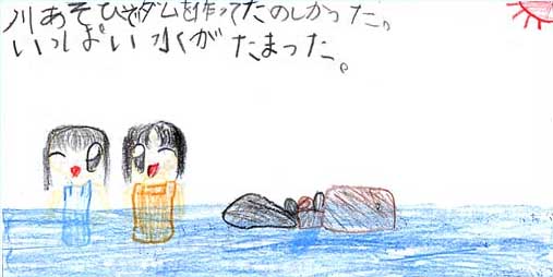 | おひさまが出ていてあつそうだね。でも川の水はつめたいから気持ちいいよね。 | |